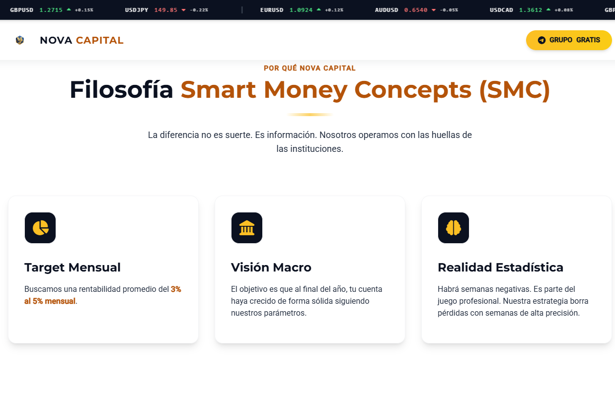 Nova Capital, una academia basada en metodología institucional (SMC), necesitaba distanciarse de la estética de "dinero fácil".